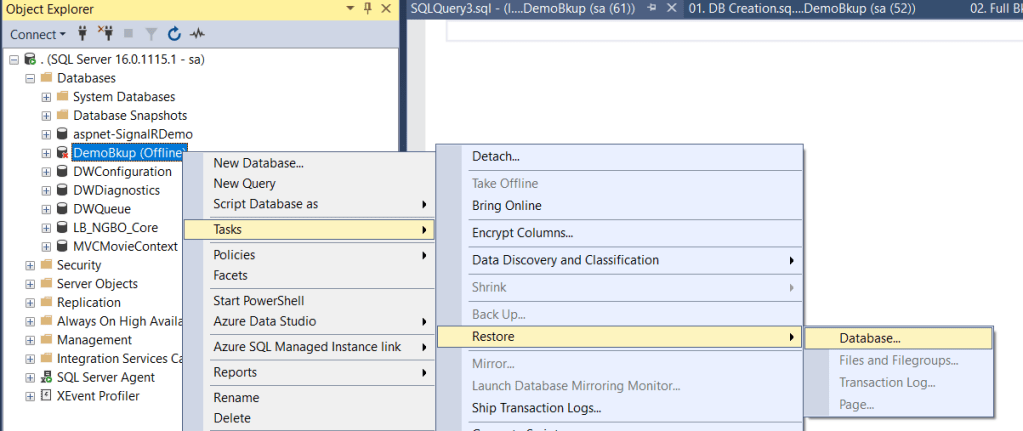 Look, for the full and differential restore we keep the database state to NORECOVERY. At the final restore we do the RECOVERY. The restoration can be done using the SSMS also. Select Restore Database option right clicking on the database name.