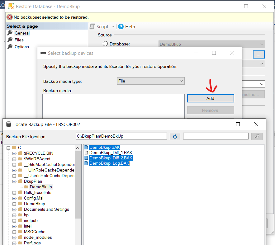 Then Click Add and select the three backup set: the full backup, last differential backup and transaction log backup.