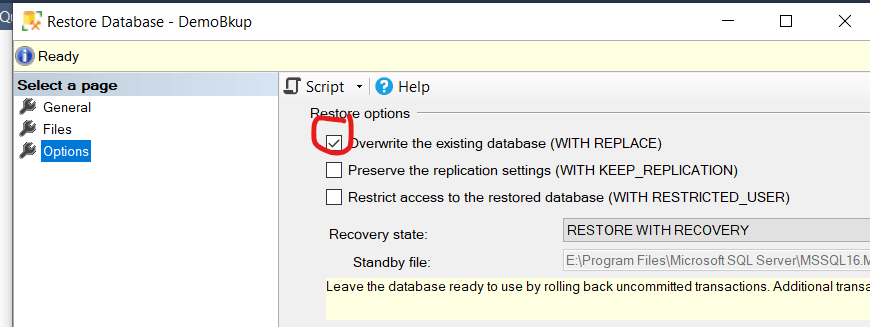 FROM DISK = 'C:\BkupPlan\DemoBkUp\DemoBkup.BAK' WITH NORECOVERY, REPLACE