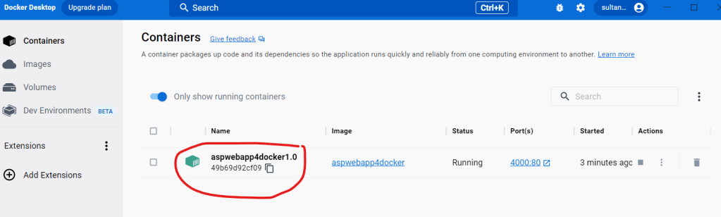 - It’ll be something like aspwebapp4docker:dev. Stop it and then remove