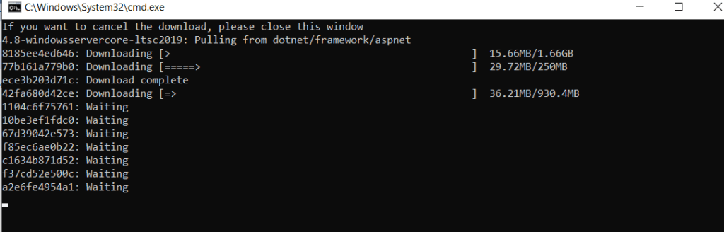 - Click Create and there will be pulling of Docker Image for Windows Server Core will be started on a separate command prompt.