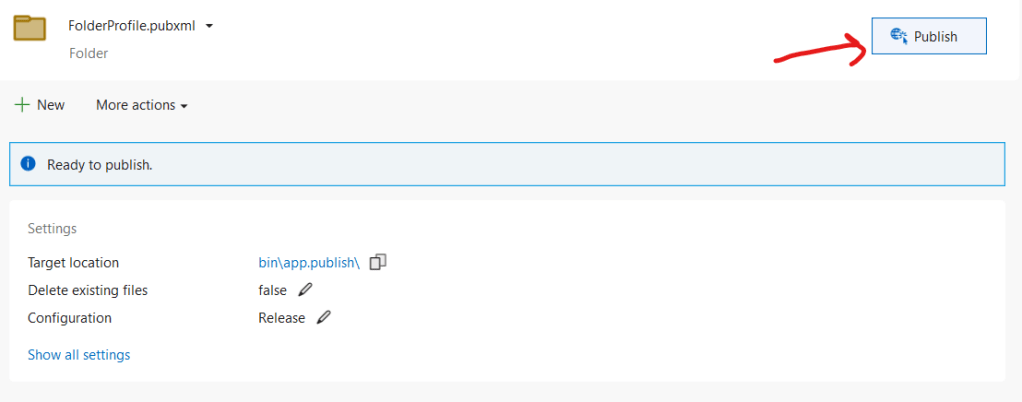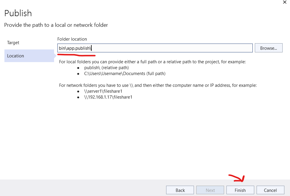 - We’ll publish it locally. Select folder to publish on next screen and put the folder name on subsequent screen.
